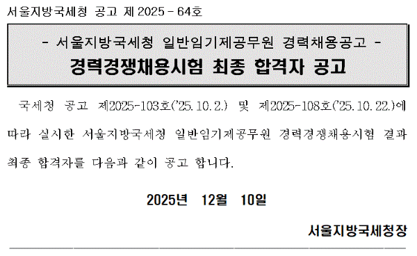 서울지방국세청 공고 제2025-64호 입니다. 국세청 공고 제2025-103호 및 제2025-108호에 따라 실시한 서울지방국세청 일반임기제공무원 경력경쟁채용시험 결과 최종 합격자를 다음과 같이 공고합니다. 2025년 12월 10일 서울지방국세청장