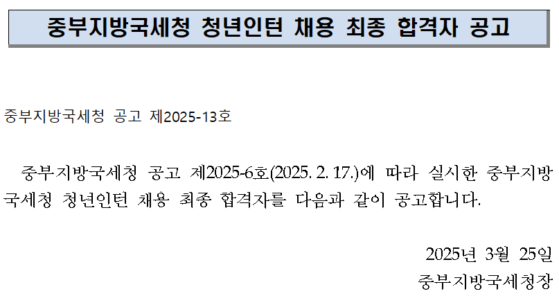 중부지방국세청 청년인턴 최종합격자 공고.hwpx