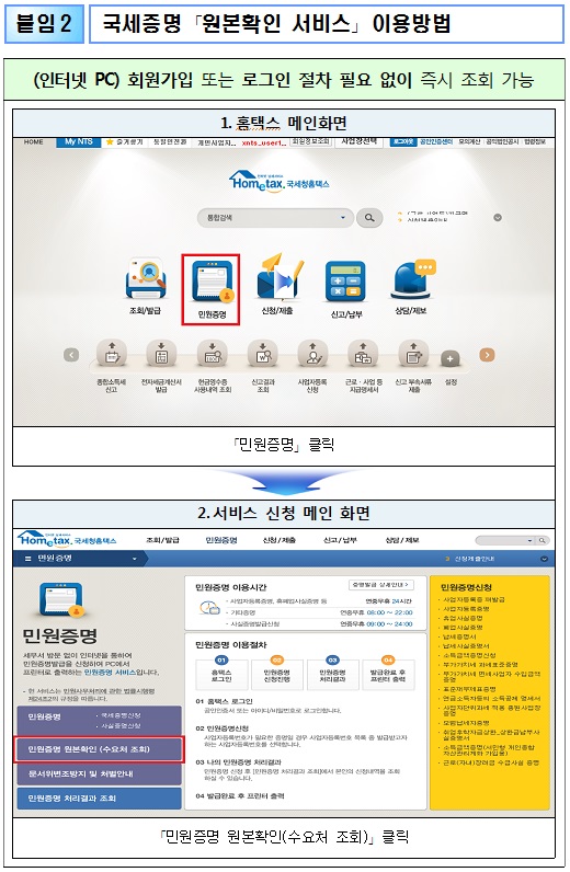 - 금융기관 등 수요처에서 민원인이 제출한 국세증명의 진위 여부를 확인할 수 있는 서비스