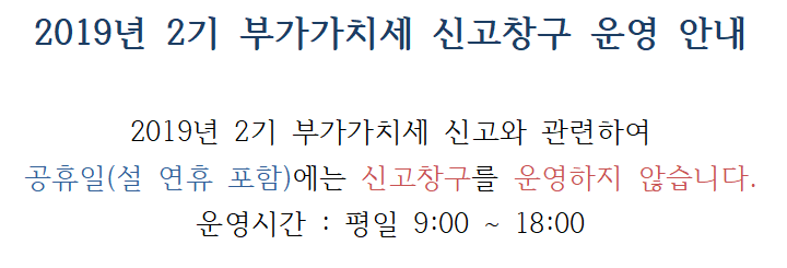2019년 2기 부가가치세 신고창구 운영 안내