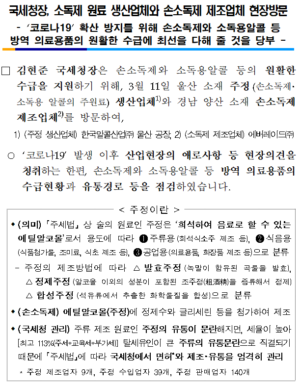 국세청장, 소독제 원료 생산업체와 손소독제 제조업체 현장방문