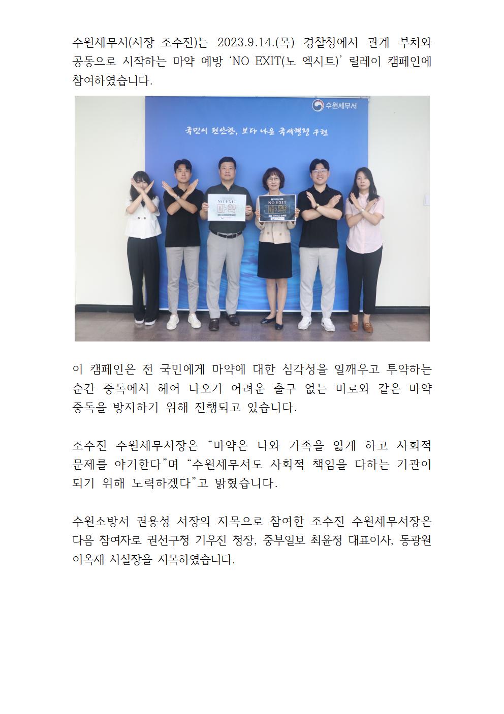 수원세무서, 마약 예방 NO EXIT(노 엑시트) 캠페인 동참