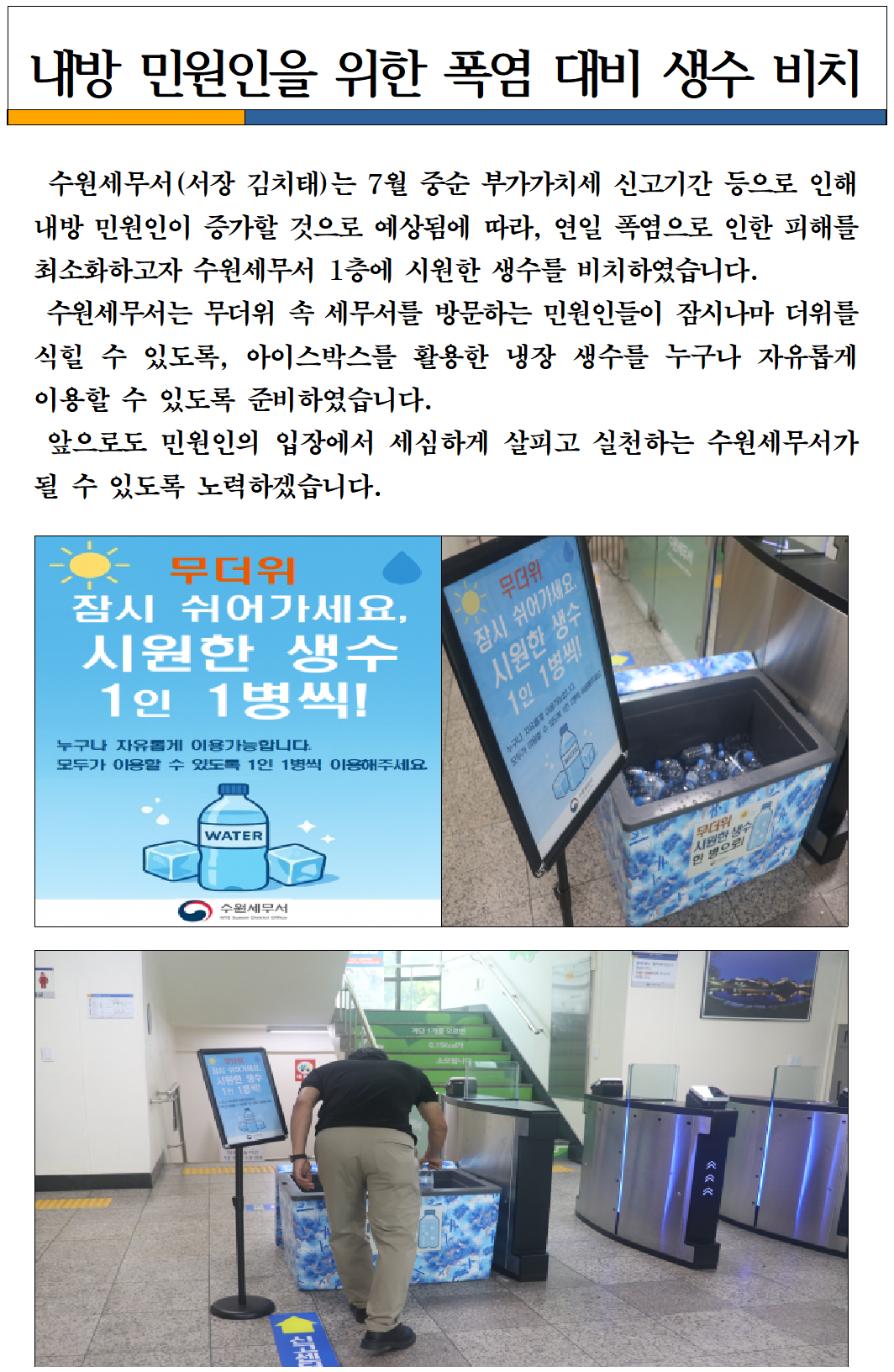 내방 민원인을 위한 폭염 대비 생수 비치