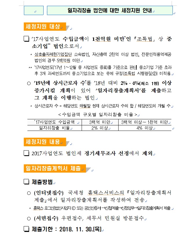 일자리 창출 법인에 대한 세정지원 안내