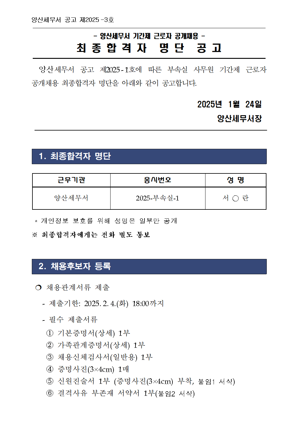 양산세무서 기간제 근로자 공개채용 최종합격자 명단 공고