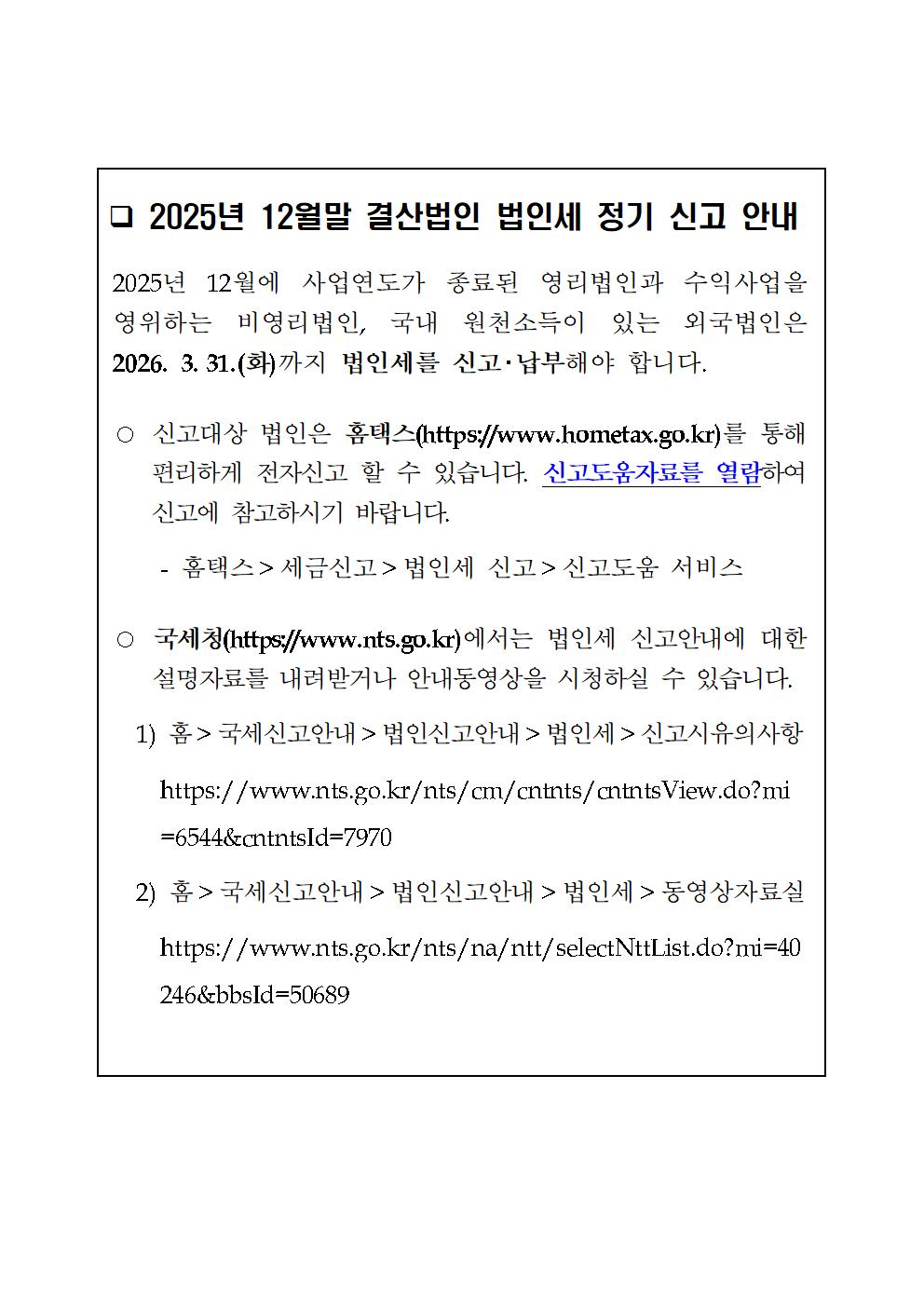 2025년 12월말 결산법인 법인세 정기 신고 안내