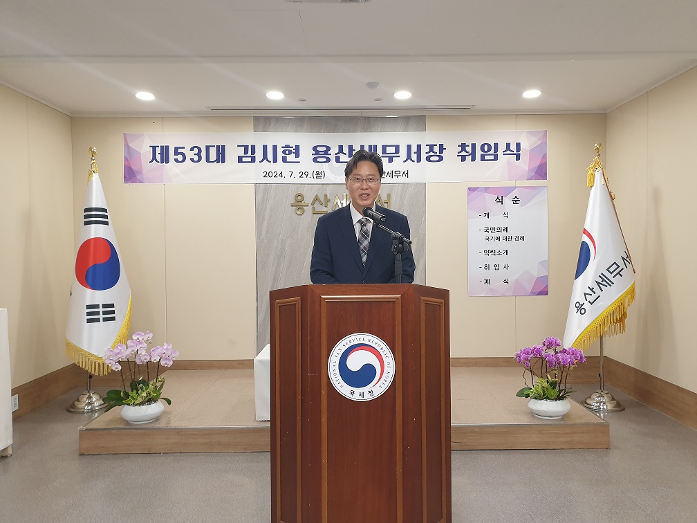 김시현 용산세무서장은 취임사에서 "지금은 사회적, 경제적 의식의 변화가 급격히 이뤄지고 있는 시기"라며 "납세서비스 기관으로서 시대 변화에 맞는 업무 수행이 요구된다"고 밝혔습니다.